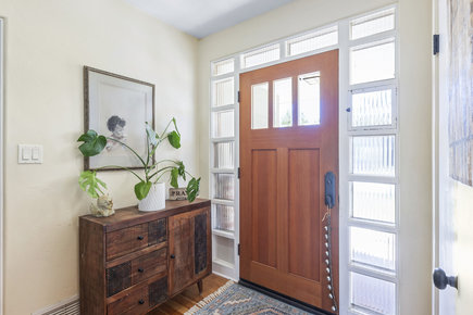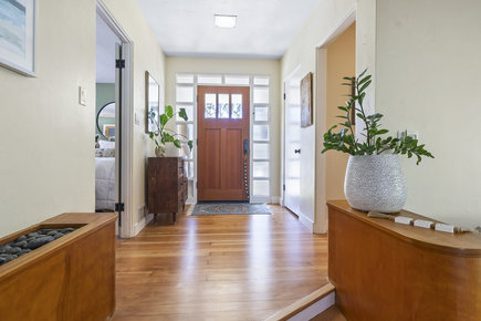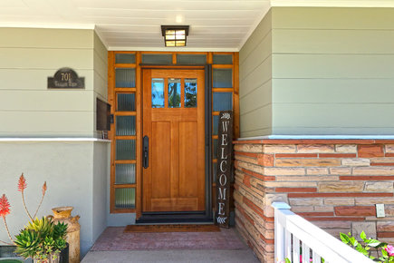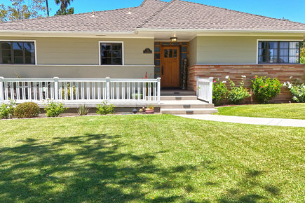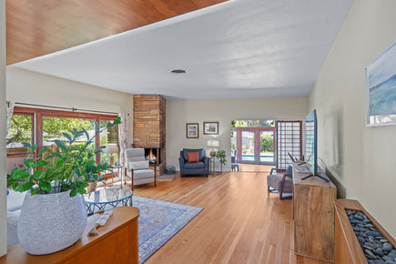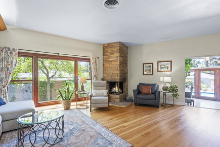 Welcome to this gorgeous, turnkey single-level home, a stunning example of Mid-Century Modern architecture, perfectly situated on an expansive 10,200 square foot corner lot. Offering 2,075 square feet of living space with 3 bedrooms and 2 bathrooms, this property blends classic style with modern comfort. Step into a spacious living room featuring high ceilings, a sunshade, a stone-faced fireplace, wood windows, accent lighting, and drapes. Adjacent is the third bedroom option, currently staged as a den, complete with luxury vinyl flooring, a stone-faced fireplace with a gas log, a beautiful beamed ceiling, and a ceiling fan. A dedicated office space boasts tile flooring, beamed ceilings, and convenient direct access to the backyard. The fabulous kitchen is a culinary dream, outfitted with pristine quartz countertops, a stylish subway tile backsplash, a farm sink, and premium stainless steel appliances, including a convenient pot filler. The laundry room features quartz countertops, a pantry, wainscoting, a utility sink, and direct access to the backyard. The primary suite is spacious, featuring a ceiling fan, drapes, and a walk-in closet. The primary bathroom maintains a charming retro tile aesthetic, complete with a tub and shower, a Roman shade, and a wall heater. Bathroom two showcases retro pink tile and sink, with a shower featuring a mosaic floor. Bedroom two is comfortable, equipped with a ceiling fan, drapes, and shades. This home is replete with other desirable amenities, including single plank hardwood floors, new baseboards, newer exterior and interior paint, a whole house fan, and retractable screens for fresh air. The exterior of the home is just as inviting. A new front porch with a rail enhances the curb appeal, complemented by newly landscaped yards. The side yard features a patio cover with pavers. The backyard is an entertainer's paradise, boasting a remodeled pool and spa with new plaster, tile, and plumbing, powered by a variable-speed pump. Newer vinyl & custom side yard fencing plus RV parking. The spacious two-car garage offers overhead storage & epoxy floors. Enjoy fresh fruit from the established Meyer lemon and Beverly Hills apple trees. The yard is well-lit with exterior lighting and efficiently managed by sprinklers with timers. Architectural details such as Redwood exterior siding, enclosed eaves, a below-grade basement, and partial rain gutters add to the home's character. Great schools and no HOA!
